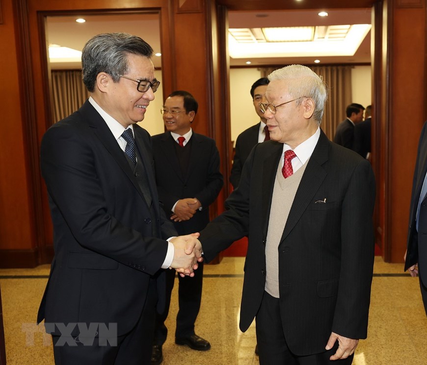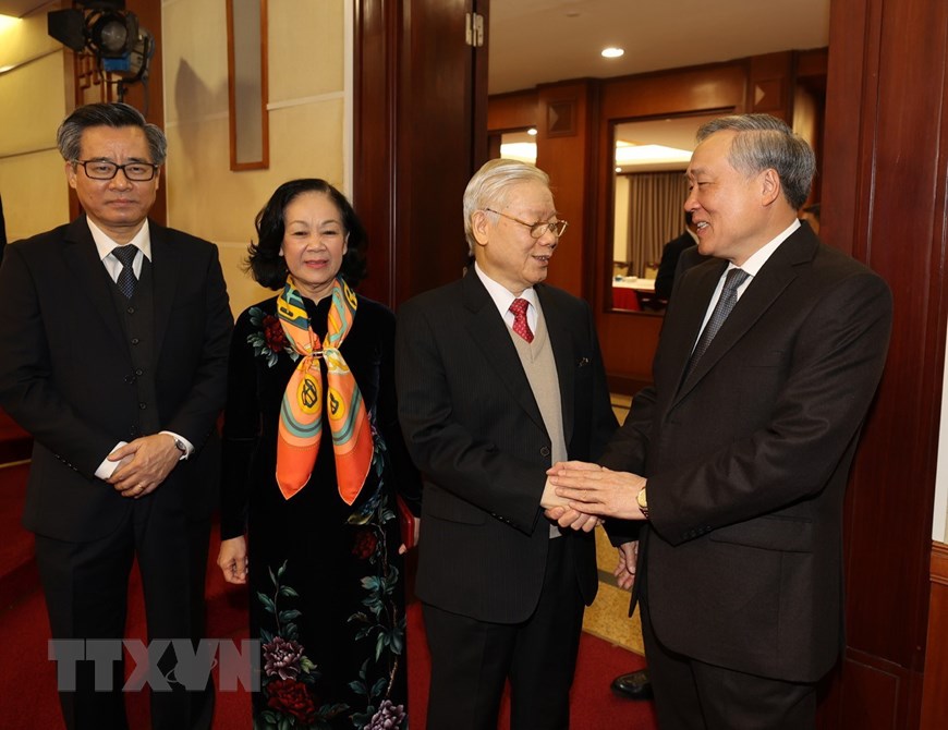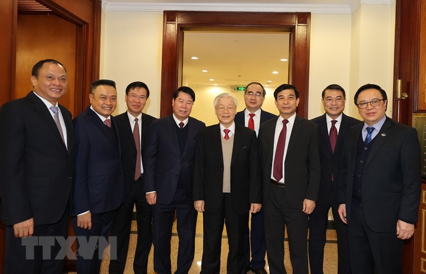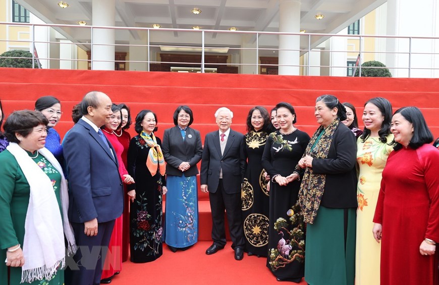 Tổng Bí thư, Chủ tịch nước Nguyễn Phú Trọng, Thủ tướng Nguyễn Xuân Phúc và Chủ tịch Quốc hội Nguyễn Thị Kim Ngân cùng các vị lãnh đạo Đảng, Nhà nước và Ban Chấp hành Trung ương Đảng Cộng sản Việt Nam khóa XII, nhiệm kỳ 2016-2021. (Ảnh: Trí Dũng/TTXVN)
