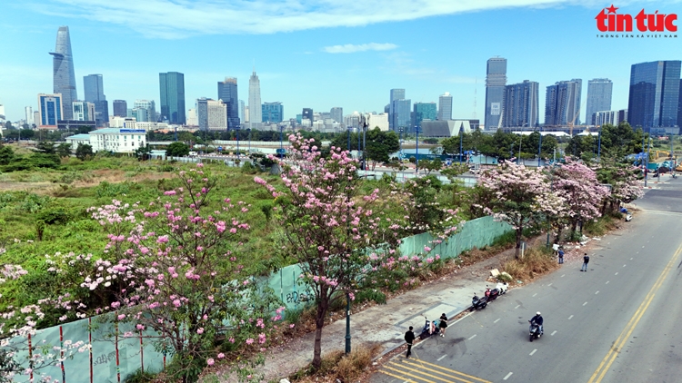 Đường Tố Hữu trong Khu đô thị mới Thủ Thiêm (thành phố Thủ Đức) trong sắc hoa kèn hồng.