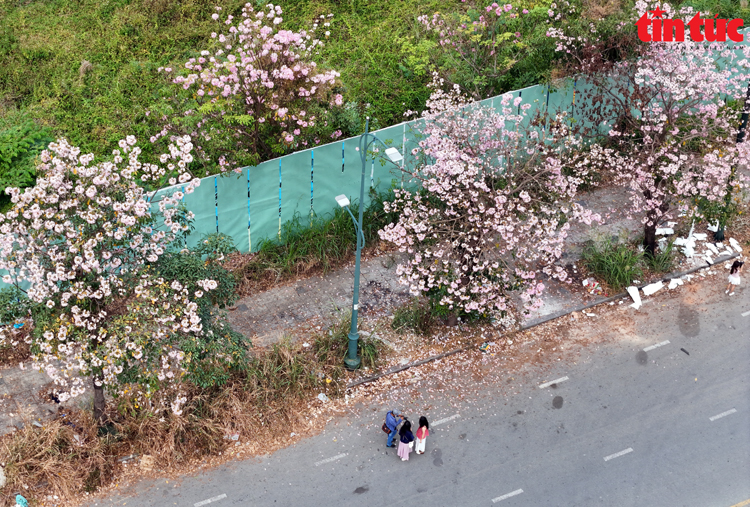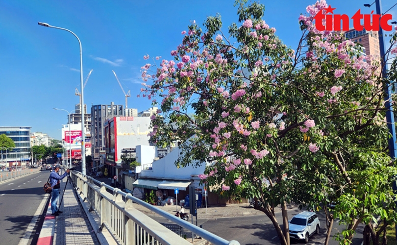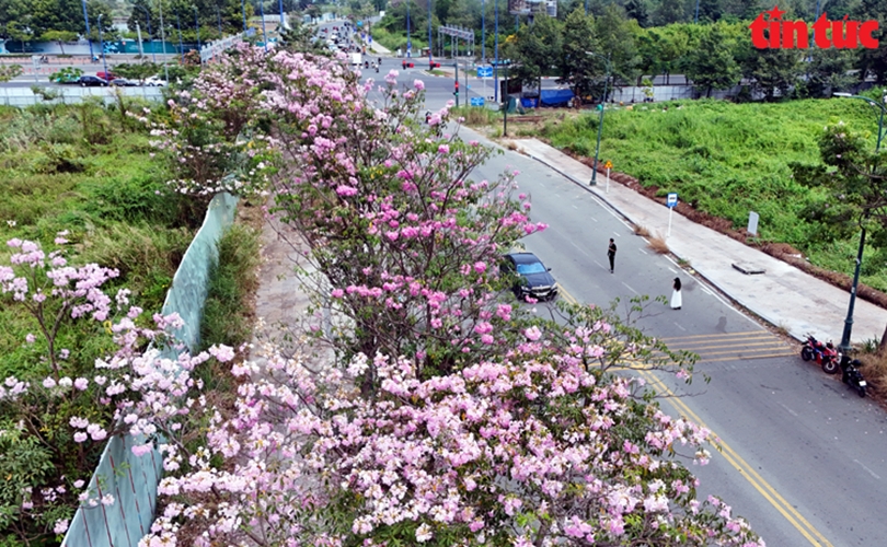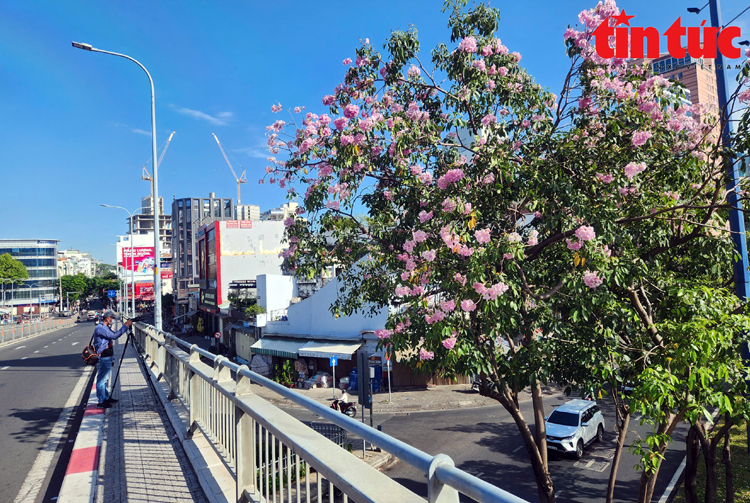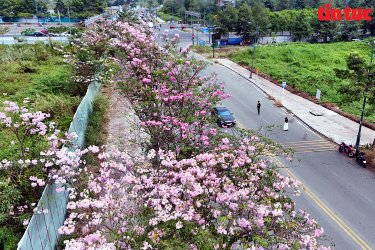Hoa kèn hồng khoe sắc trên đường Võ Văn Kiệt, khu vực đầu hầm Thủ Thiêm (Quận 1)