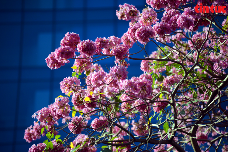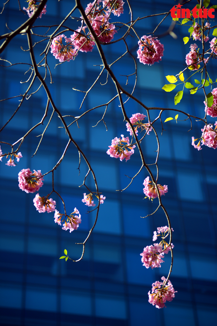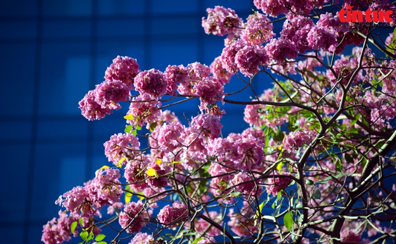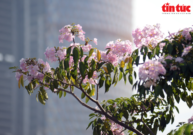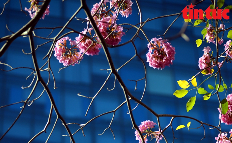 Hoa kèn hồng khoe sắc bên tòa nhà cao tầng.