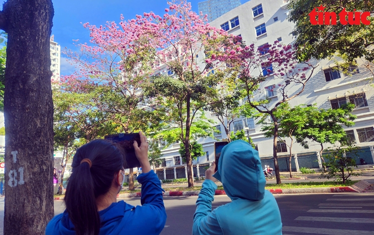 Người đi đường dùng điện thoại chụp ảnh những cây hoa kèn hồng bung nở trên đường Hàm Nghi (Quận 1).