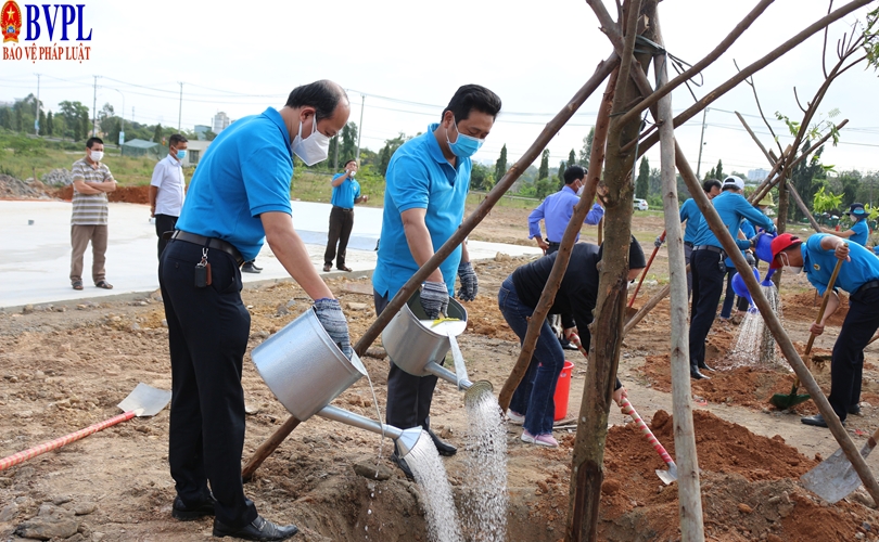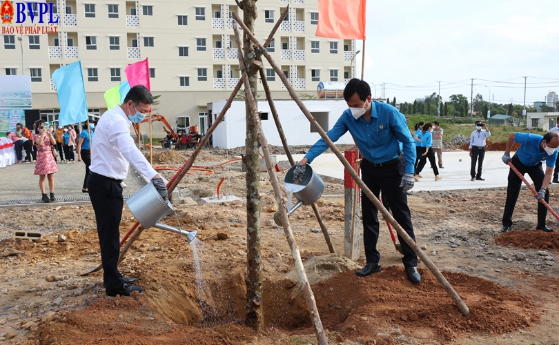 Đoàn viên, người lao động đã cùng nhau trồng cây xanh trong khu vực Nhà ở công nhân Khu công nghiệp Hòa Cầm (TP Đà Nẵng) (ảnh: LT)