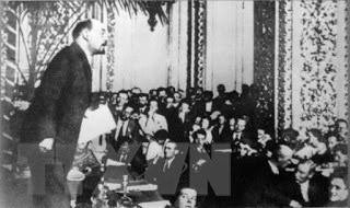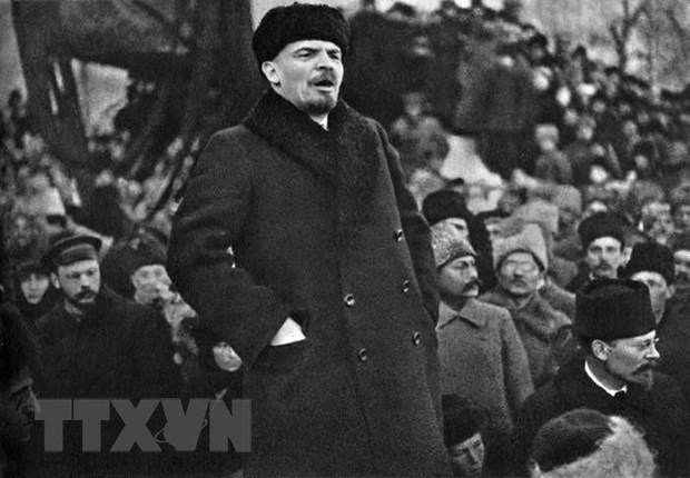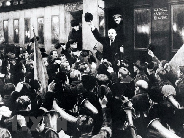 Ngày 16/4/1917 (3/4 theo lịch Nga cũ), V.I.Lenin từ Phần Lan trở về Nga để lãnh đạo phong trào cách mạng. Hàng vạn quần chúng đã tổ chức tuần hành, míttinh để chào đón người con ưu tú của nước Nga tại nhà ga Phần Lan ở thành phố Petrograd (trong ảnh). Tại đây, Lenin trình bày Luận cương Tháng Tư, một văn kiện mang tính cương lĩnh đề ra đường lối giành chiến thắng cho cuộc cách mạng xã hội chủ nghĩa với khẩu hiệu Tất cả chính quyền về tay các Soviet!” (Ảnh: Tư liệu/TTXVN)