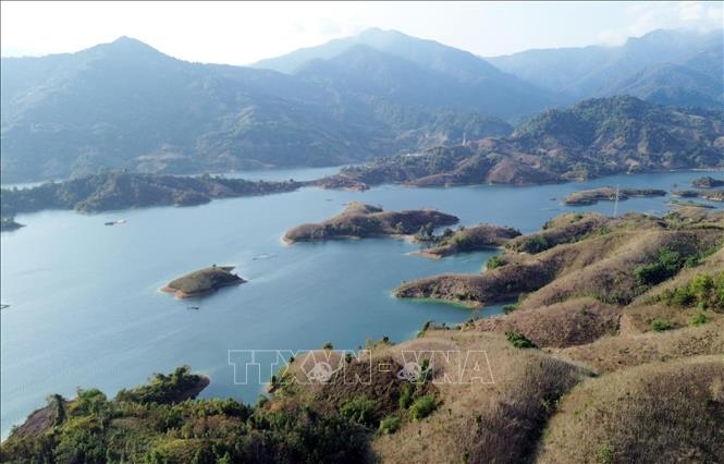 Lòng hồ với nhiều ốc đảo lớn nhỏ nhìn như một bức tranh sơn thủy hữu tình giữa núi rừng Tây Bắc.