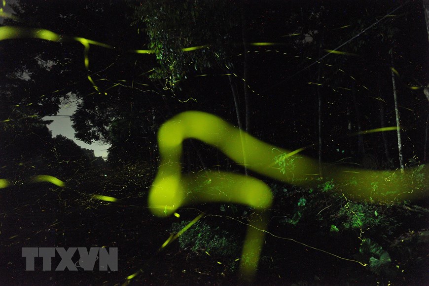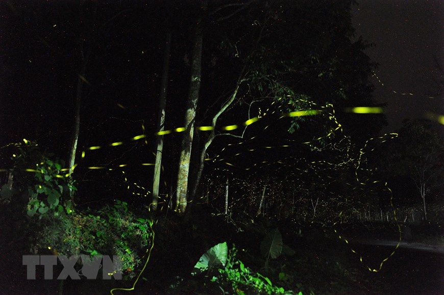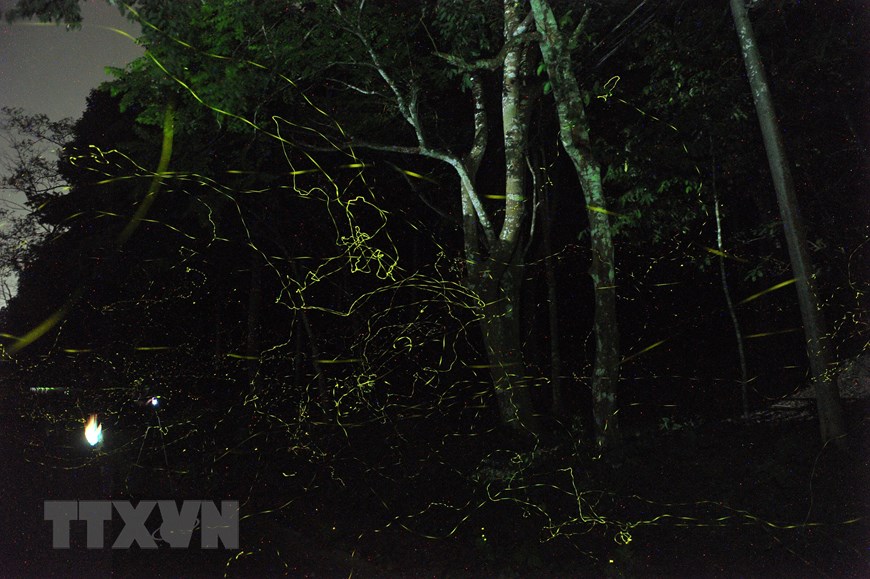 Cứ vào cuối tháng Tư đầu tháng Năm hàng năm, khi tiết trời chuyển sang mùa Hạ là lúc báo hiệu một mùa đom đóm tại Vườn Quốc gia Cúc Phương (huyện Nho Quan, tỉnh Ninh Bình). Trong ảnh: Những vệt sáng mang sắc xanh vàng được tạo ra bởi hàng vạn con đom đóm làm khu rừng rực sáng. (Ảnh: Minh Đức/TTXVN)
