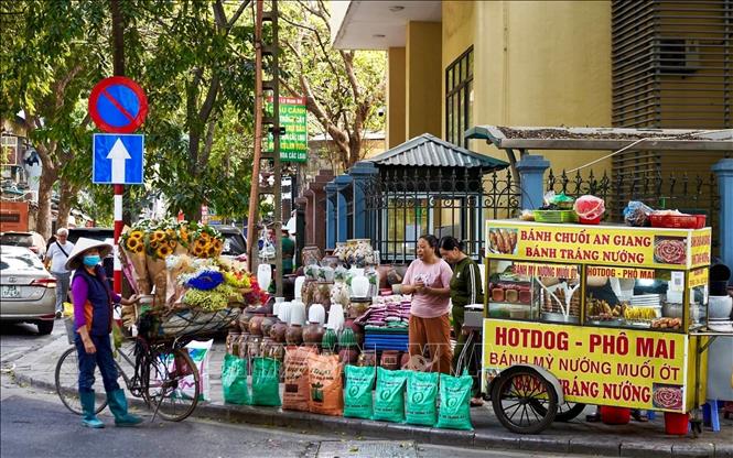 Sau 2 tuần ra quân tổng kiểm tra, xử lý vi phạm về trật tự đô thị, trật tự công cộng, tình trạng lấn chiếm vỉa hè vẫn dễ dàng có thể bắt gặp ở nhiều nơi trong khu vực phố cổ (ảnh chụp ngày 7/3). Ảnh: Quỳnh Anh/TTXVN