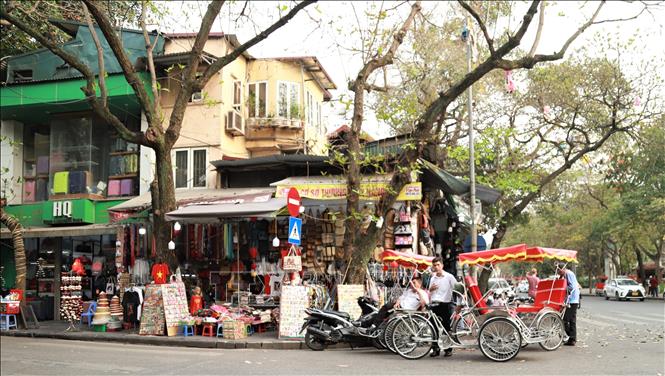 Hàng quán, xích lô đậu chiếm hết vỉa hè, lòng đường khu vực gần Hồ Hoàn Kiếm. Ảnh: Thanh Thảo/TTXVN