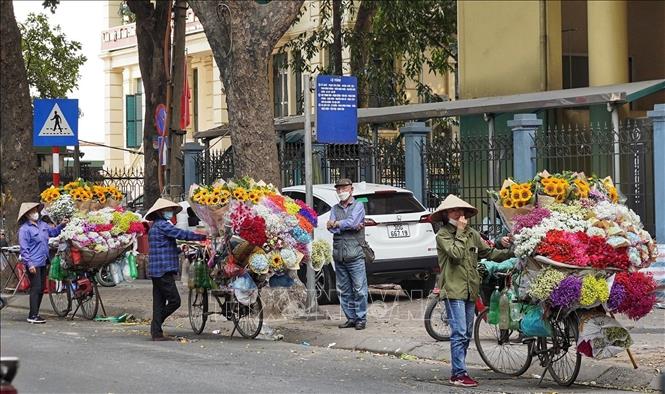 Một loạt xe hoa dựng dưới lòng đường Phan Đình Phùng gây cản trở giao thông. Ảnh: Quỳnh Anh/TTXVN