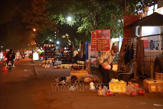 Nhiều sạp hàng rong nhỏ bày bán hàng dưới lòng đường trên phố Tam Trinh (quận Hoàng Mai) (ảnh chụp tối 13/3). Ảnh: Thanh Thảo/TTXVN