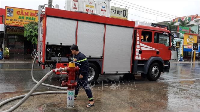 Vẫn còn lấy nước chữa cháy quán Karaoke trong trời mưa. Ảnh: Chí Tưởng/TTXVN