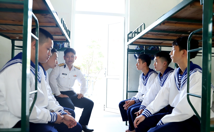 Tiểu đội trưởng ở Tiểu đoàn 355, Vùng 3 Hải quân tận tình hướng dẫn chiến sĩ mới gấp chăn màn. (Ảnh: HD)