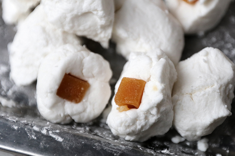 Bánh trôi nặn viên nhỏ có nhân là đường đỏ, bánh chay nặn với kích thước lớn hơn với nhân đỗ xanh bên trong.