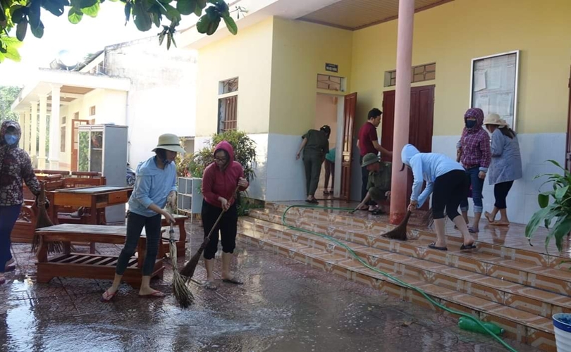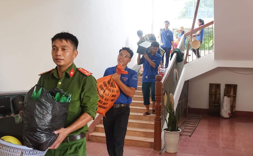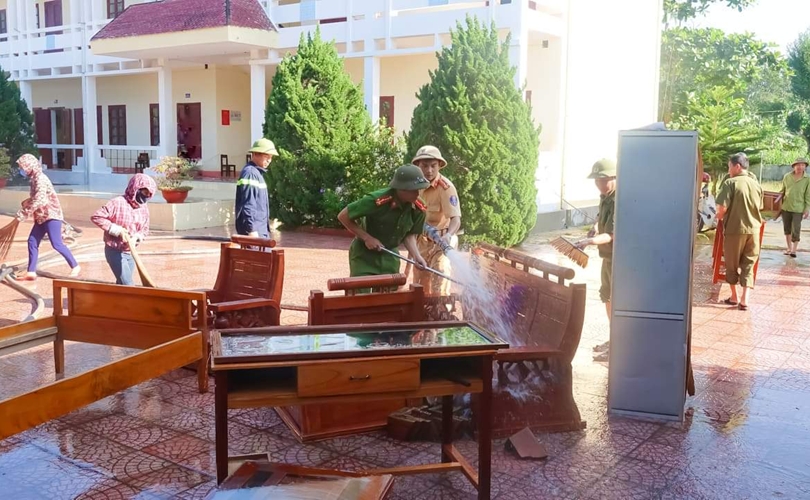 Cán bộ Công an giúp thầy cô thu dọn các cây gãy đổ, dọn bùn non trong sân trường và lau chùi bàn ghế, vận chuyển dụng cụ trang thiết bị dạy học, kê lại bàn ghế để kịp thời khai giảng năm học mới vào thứ 2 ngày 9/9/2019.