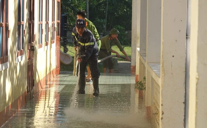 Công an huyện Hương Sơn huy động phương tiện và 30 CBCS xuống giúp trường học dọn dẹp vệ sinh.