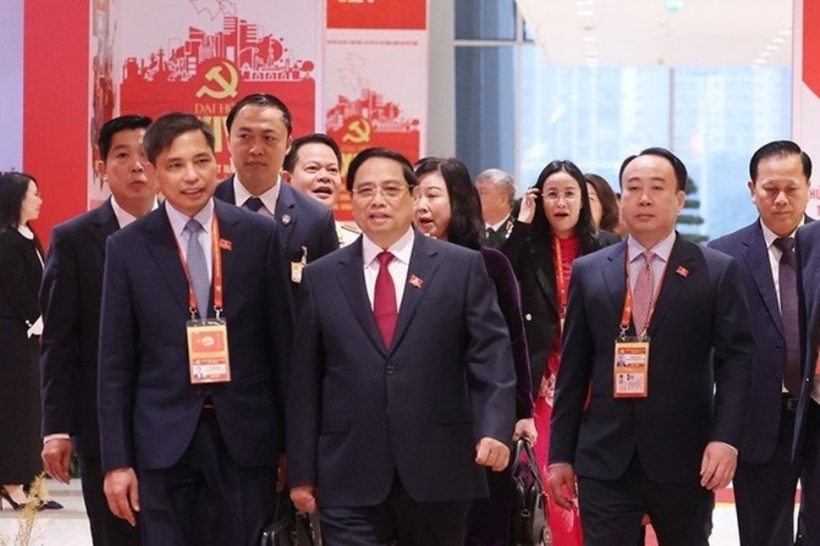 | Thủ tướng Phạm Minh Chính cùng đoàn đại biểu Đảng bộ Chính phủ đến dự phiên thảo luận tại hội trường về các văn kiện Đại hội sáng 21/1. Ảnh:daihoidangtoanquoc.vn |