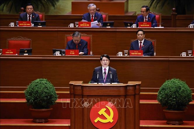 Tiếp theo chương trình, đồng chí Tổng Bí thư Tô Lâm, Trưởng Tiểu ban Văn kiện trình bày Báo cáo của Ban Chấp hành Trung ương Đảng khóa XIII về các văn kiện trình Đại hội XIV của Đảng.