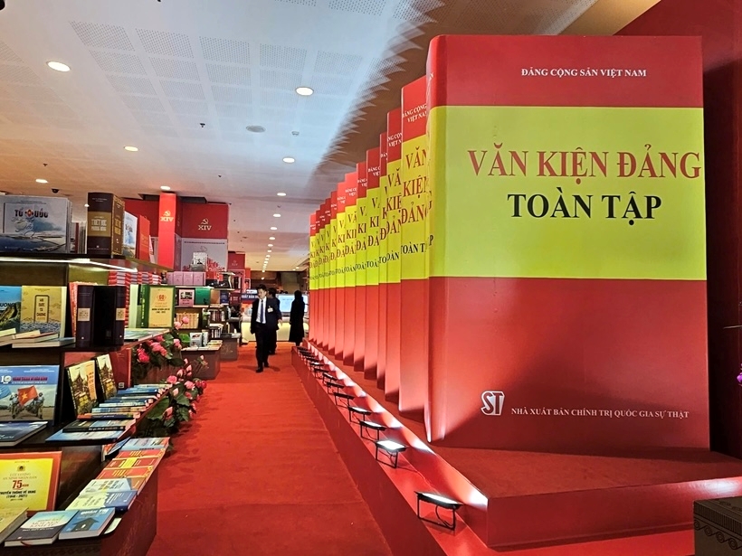 | Gian trưng bày sách, báo chào mừng Đại hội đại biểu toàn quốc lần thứ XIV của Đảng. (Ảnh: Hồng Nguyên - Lê Sử) |