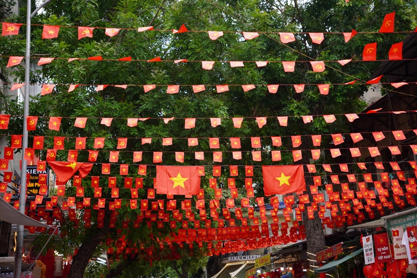 | Màu đỏ của lá cờ Tổ quốc, cờ Đảng tạo nên một không gian đầy tự hào và phấn khởi. |