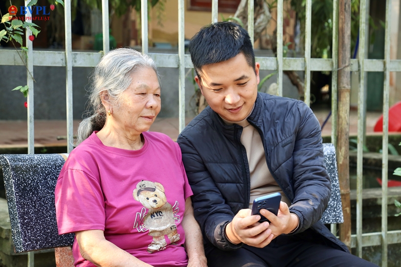 | Cán bộ văn hoá xã Cúc Phương hướng dẫn người già sử dụng app điện tử trên điện thoại. |