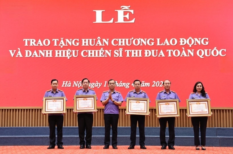 | Đồng chí Hồ Đức Anh - Phó Viện trưởng Thường trực VKSND tối cao trao tặng danh hiệu "Chiến sỹ thi đua toàn quốc" của Thủ tướng Chính phủ cho 5 cá nhân.(Đồng chí Trần Hoài Nam đứng thứ 2 bên phải qua). |