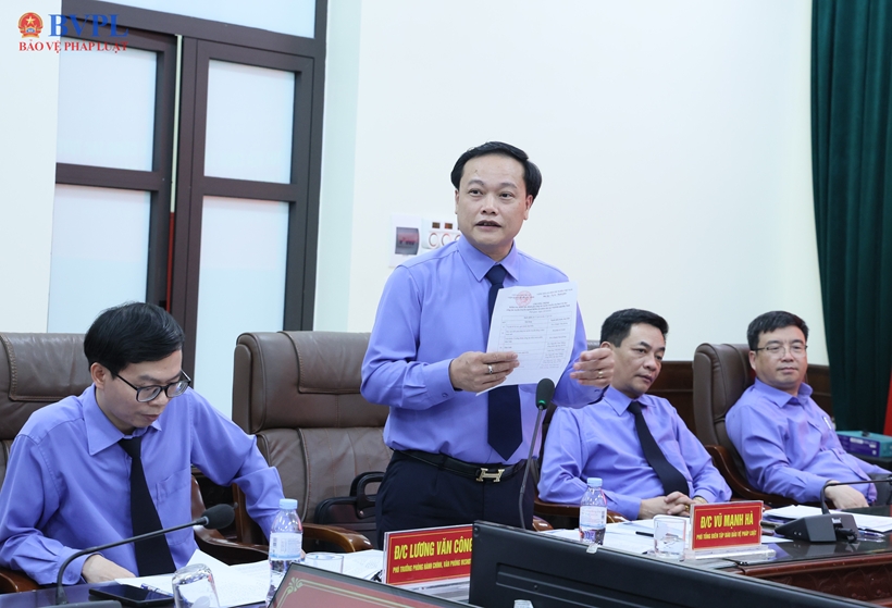 | Đồng chí Vũ Mạnh Hà, Phó Tổng Biên tập Báo Bảo vệ pháp luật, Tổ trưởng Tổ giúp việc Ban Chỉ đạo công tác tuyên truyền ngành KSND phát biểu. |