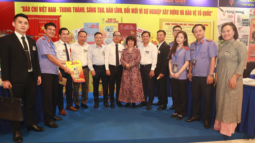 | Đồng chí Nguyễn Huy Tiến - Bí thư Đảng ủy, Viện trưởng VKSND tối cao cùng cán bộ, phóng viên của Báo Bảo vệ pháp luật tại gian hàng trưng bày Báo Bảo vệ pháp luật. |