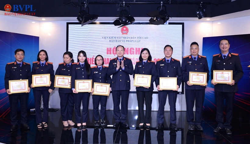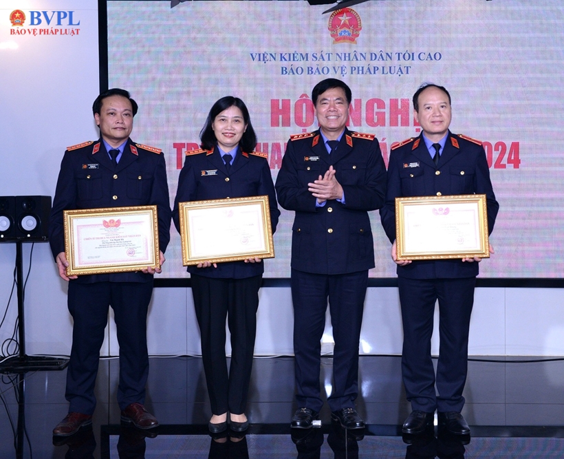 | Đồng chí Nguyễn Quang Dũng, Phó Viện trưởng VKSND tối cao trao Bằng khen của Viện trưởng VKSND tối cao tặng 3 Chiến sỹ thi đua ngành KSND gồm: đồng chí Nguyễn Văn Thắng, Tổng Biên tập và hai đồng chí Phó Tổng Biên tập Vũ Mạnh Hà, Phan Thị Kim Hoa. |