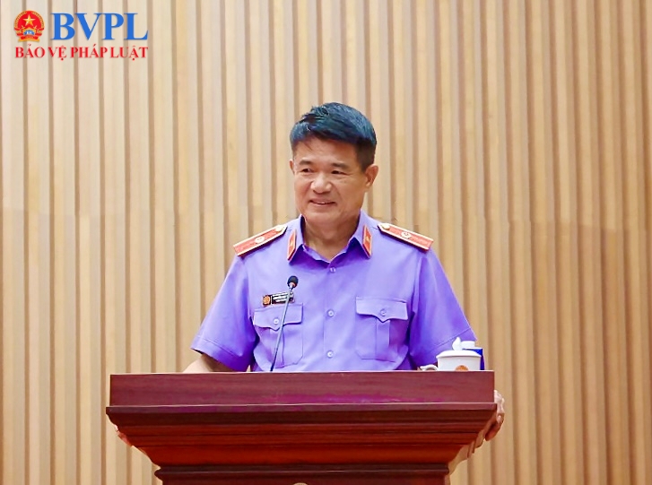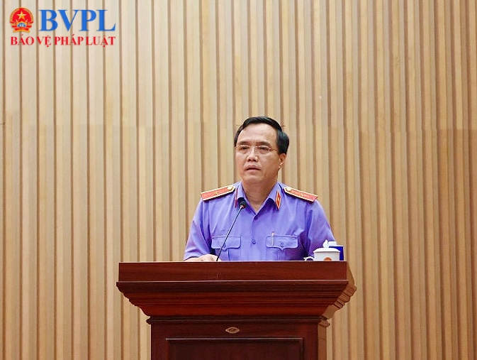 | Đồng chí Nguyễn Văn Khoát, Bí thư Đảng uỷ, Hiệu trưởng Trường Đại học Kiểm sát trình bày tham luận. |