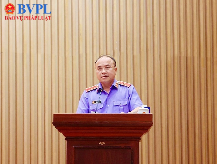 | Đồng chí Hồ Đức Anh, Phó Bí thư Thường trực Đảng ủy, Phó Viện trưởng Thường trực VKSND tối cao phát biểu tại Hội nghị. |