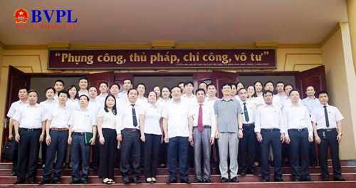 | Đồng chí Nguyễn Hòa Bình chụp ảnh lưu niệm với cán bộ Tòa án nhân dân tỉnh Nghệ An |