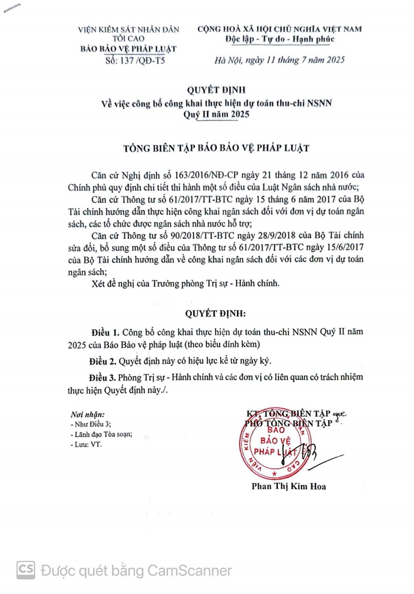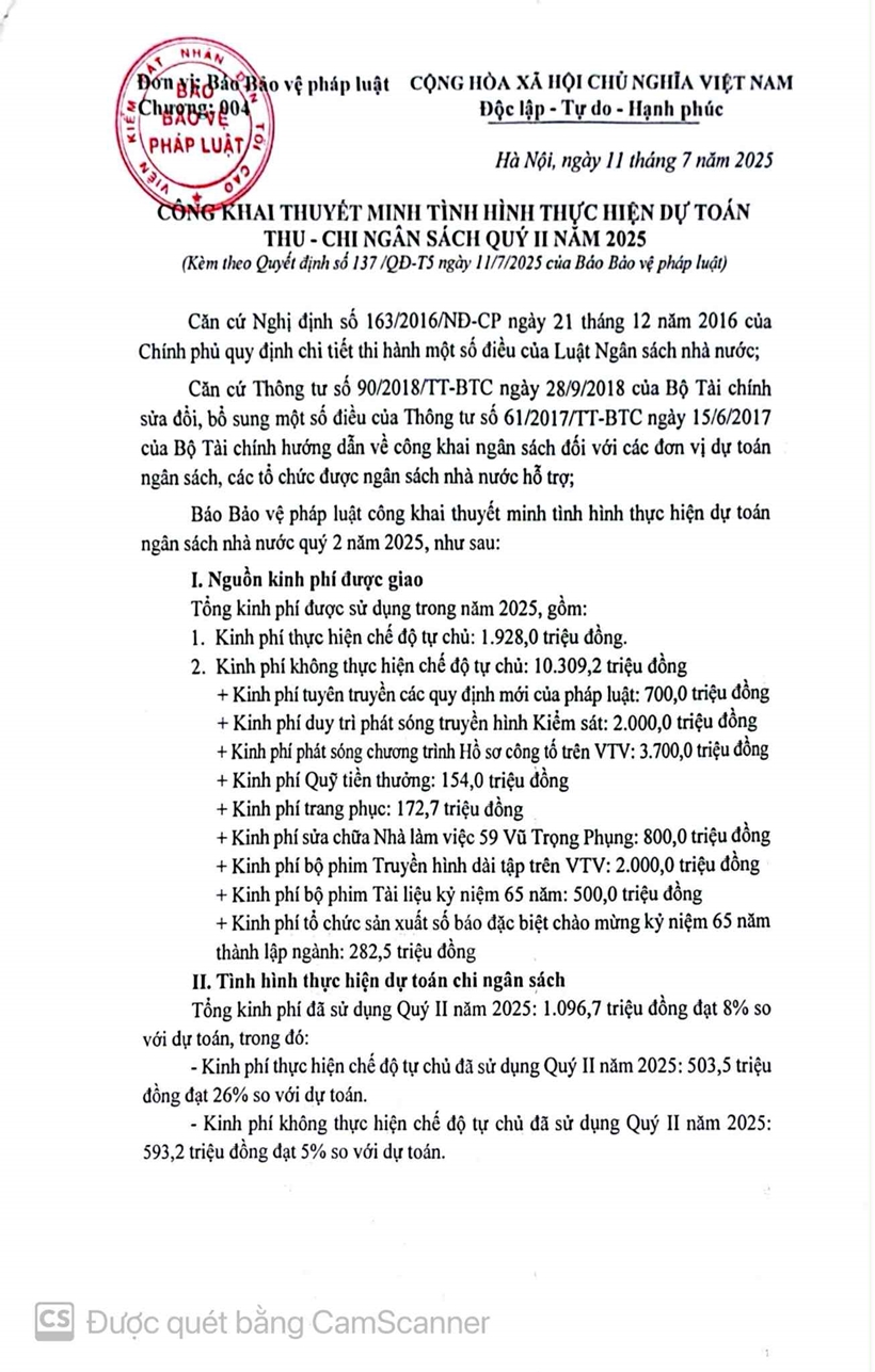 Thực hiện quy định về công khai tài chính theo Thông tư số 61/2017/TT-BTC ngày 15/6/2017, Báo Bảo vệ pháp luật đăng công khai thực hiện dự toán thu-chi NSNN Quý II năm 2025 như sau: