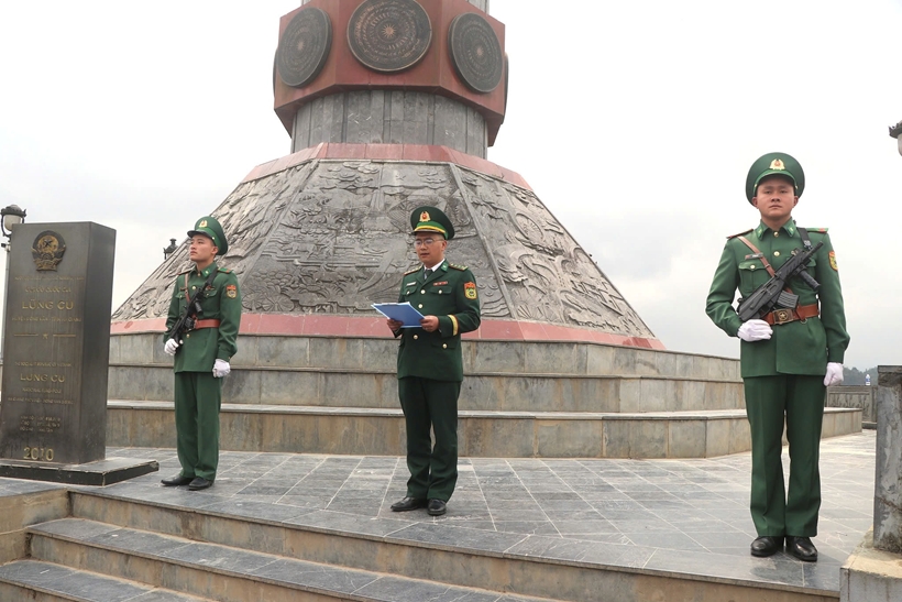 | Đoàn công tác Thực hiện nghi thức Chào cờ và sinh hoạt chính trị dưới cờ tại cột cờ Lũng Cú. |