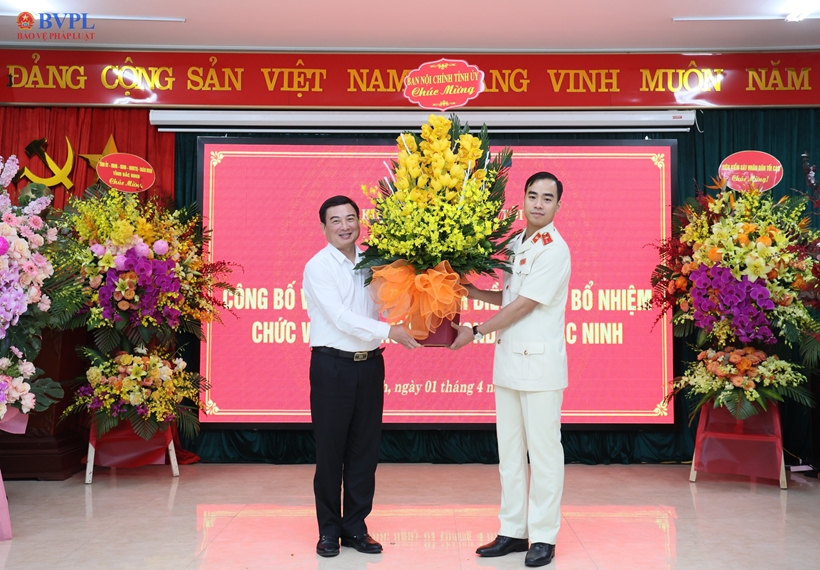 | Đồng chí Nguyễn Hồng Thái, Bí thư Tỉnh ủy Bắc Ninh và đồng chí Nguyễn Duy Giảng, Phó Viện trưởng VKSND tối cao tặng hoa chúc mừng đồng chí Phạm Hải Anh được bổ nhiệm giữ chức Viện trưởng VKSND tỉnh Bắc Ninh. |