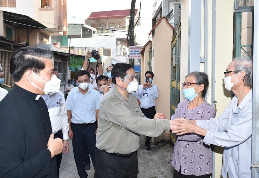 | Thủ tướng động viên bà con giáo xứ Tân Mai, phường Tân Mai, TP. Biên Hòa, yên tâm thực hiện giãn cách. Ảnh: Nhật Bắc |