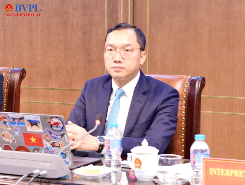 Đồng chí Hoàng Minh Tiến, Cục trưởng Cục Thống kê tội phạm và chuyển đổi số-VKSND tối cao (Cục 2) và ông Ts. Batbold, Cục trưởng Cục Phát triển số và Công nghệ thông tin, VKS tối cao Mông Cổ- trưởng Đoàn chủ trì Hội thảo.