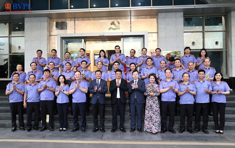 | Đồng chí Nguyễn Huy Tiến, Viện trưởng VKSND tối cao và đồng chí Nguyễn Thanh Lâm, Tổng Giám đốc Đài Truyền hình Việt Nam cùng các đại biểu chụp ảnh lưu niệm tại Đài Truyền hình Việt Nam. |