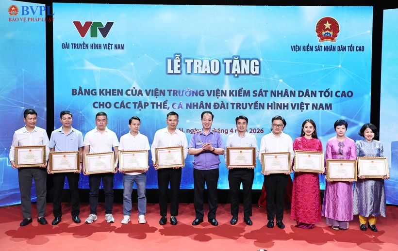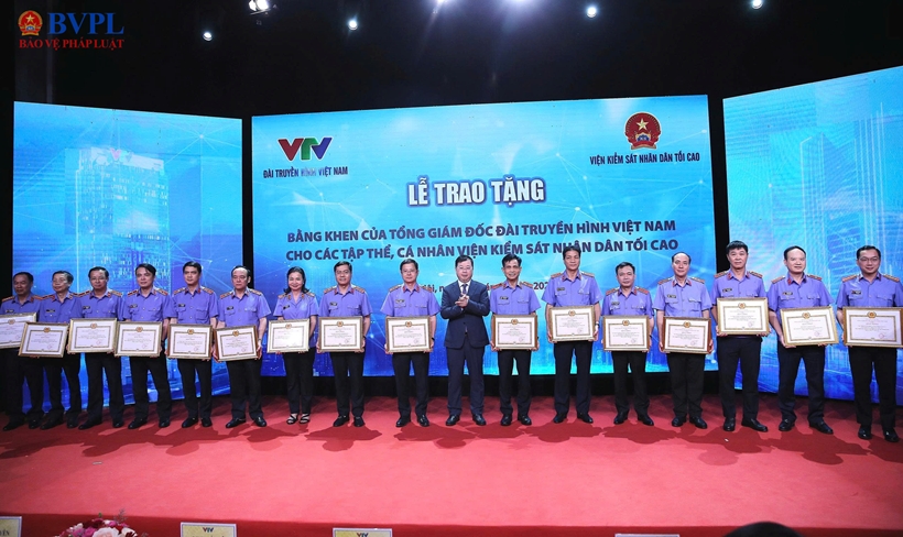 | Đồng chí Nguyễn Thanh Lâm, Tổng Giám đốc Đài Truyền hình Việt Nam tặng Bằng khen cho 7 cá nhân thuộc VKSND tối cao đã có thành tích xuất sắc trong phối hợp tổ chức sản xuất, phát sóng Chương trình "Hồ sơ Công tố - Kiểm sát". |