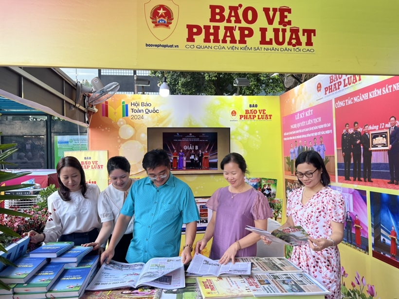 Đồng chí Nguyễn Thị Thanh Mai (áo tím) ấn tượng với những ấn phẩm của Báo Bảo vệ pháp luật được trưng bày tại Hội báo.