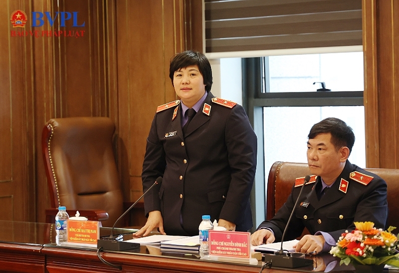 | Chánh Thanh tra VKSND tối cao Mai Thị Nam phát biểu tiếp thu ý kiến chỉ đạo của lãnh đạo VKSND tối cao. |