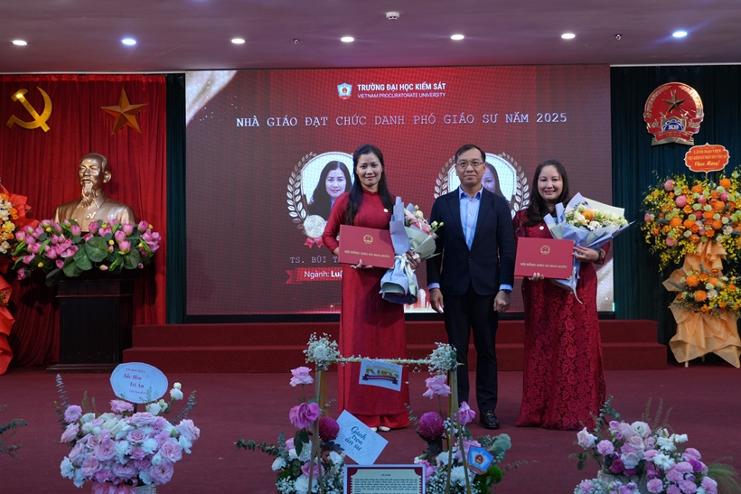 | Đồng chí Hồ Đức Anh, Phó Bí thư Thường trực Đảng ủy, Phó Viện trưởng VKSND tối cao, Chủ tịch Hội đồng Trường trao Quyết định công nhận đạt tiêu chuẩn chức danh Phó Giáo sư năm 2025 đối với: PGS.TS. Bùi Thị Hạnh, Phó Hiệu trưởng, và PGS.TS. Nguyễn Nhân Ái. |