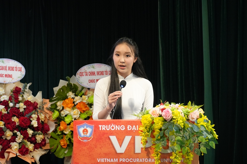 | Sinh viên Ninh Khánh Nhi, lớp K13A, đại diện cho học viên, sinh viên Nhà trường phát biểu tri ân các thầy, cô tại buổi lễ. |