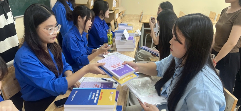 Cán bộ Thư viện Nhà trường cùng các bạn Đoàn thanh niên hỗ trợ phục vụ các bạn Tân sinh viên sách tài liệu giáo trình cho năm học mới |