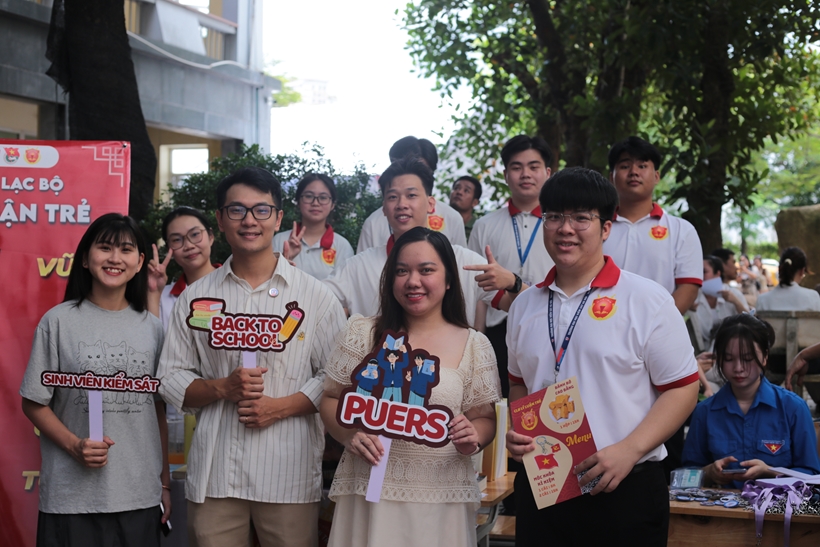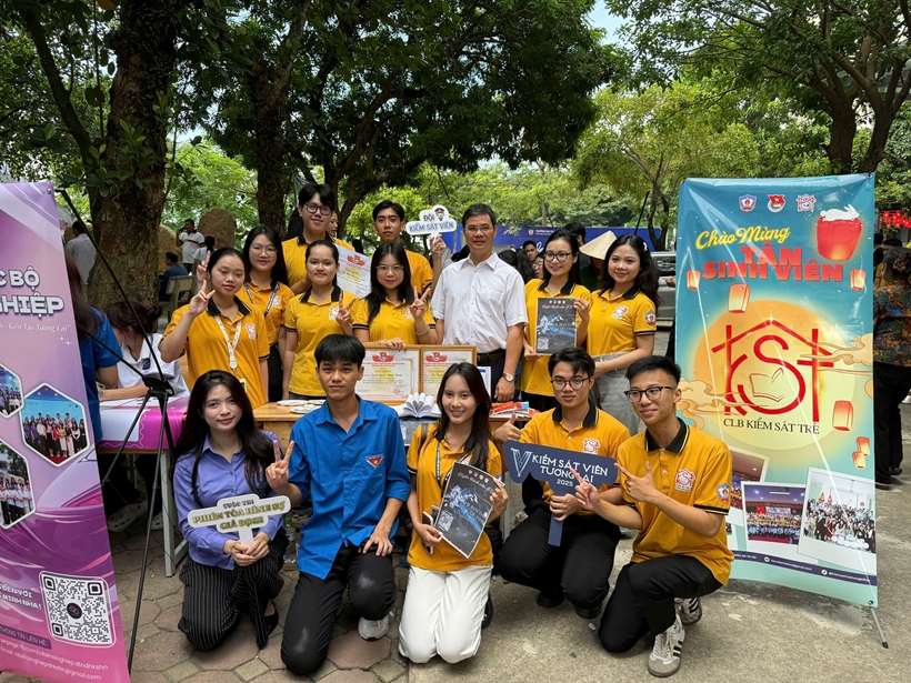 TS. Hoàng Anh Tuyên, Phó Hiệu trưởng Nhà trường chụp ảnh cùng các bạn CLB Kiểm sát trẻ chào mừng các bạn Tân sinh viên khóa mới |