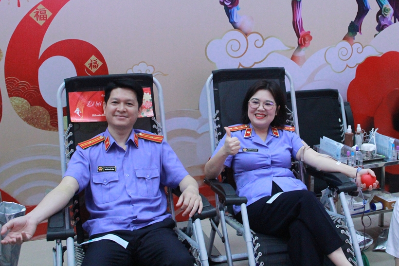 | Đồng chí Nguyễn Phúc Long, Phó Vụ trưởng Vụ 1, VKSND tối cao cùng các đoàn viên thanh niên trong đơn vị tại chương trình hiến máu tình nguyện. |