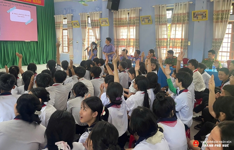 | Các em học sinh sôi nổi tham gia trả lời câu hỏi tìm hiểu pháp luật tại chương trình tuyên truyền pháp luật do Chi đoàn VKSND TP Huế phối hợp tổ chức. |