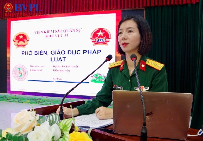 | Đại úy Tô Thị Tuyết - Kiểm sát viên VKSQS Khu vực 51 giới thiệu Chuyên đề 1. |
