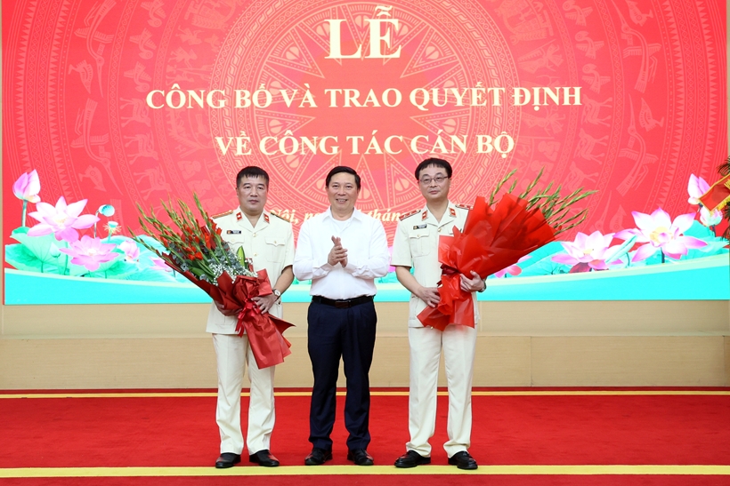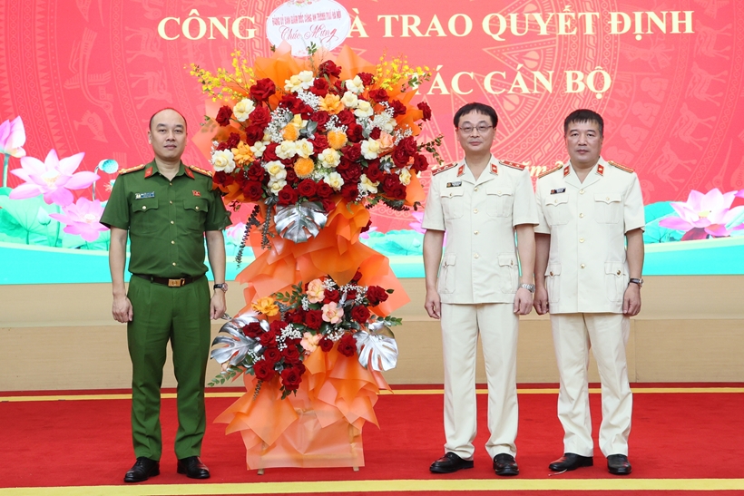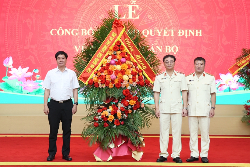 | Đại diện lãnh đạo Công an TP Hà Nội tặng hoa chúc mừng đồng chí Nguyễn Hoài Nam và đồng chí Đỗ Dương Toàn. |