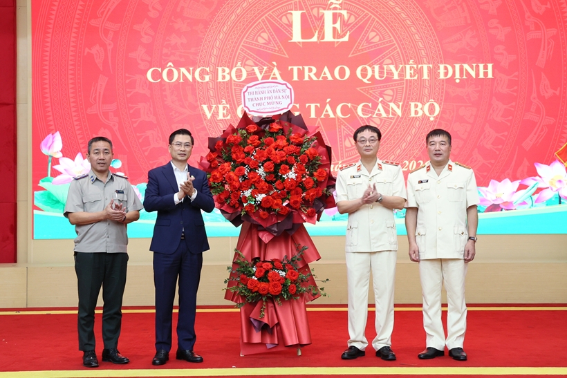 | Đại diện lãnh đạo Thi hành án dân sự TP Hà Nội tặng hoa chúc mừng đồng chí Nguyễn Hoài Nam và đồng chí Đỗ Dương Toàn. |