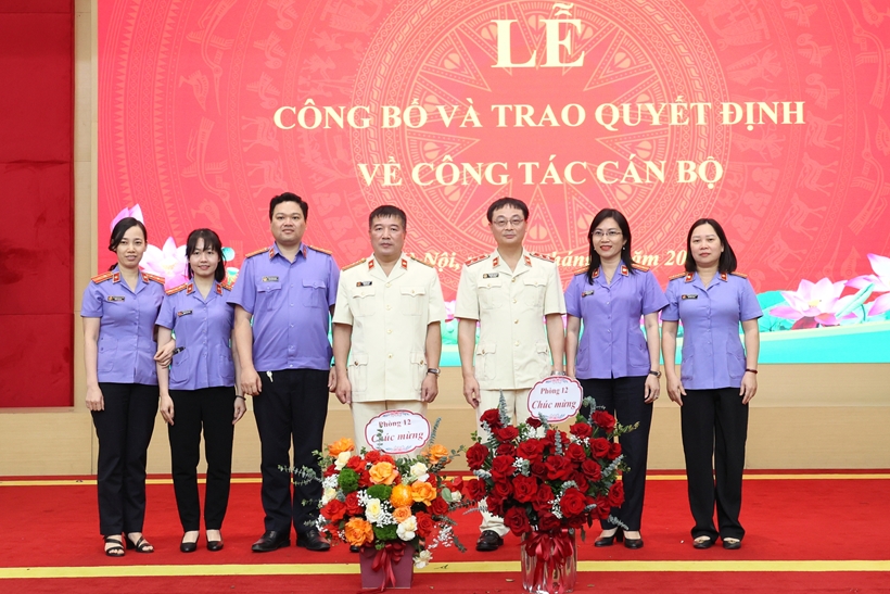 | Tập thể Phòng 12 tặng hoa chúc mừng đồng chí Nguyễn Hoài Nam và đồng chí Đỗ Dương Toàn. |
