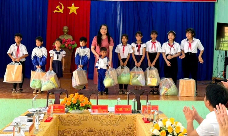 | Đồng chí Phạm Thị Kim Liên tặng quà cho các em học nghèo vượt khó. |